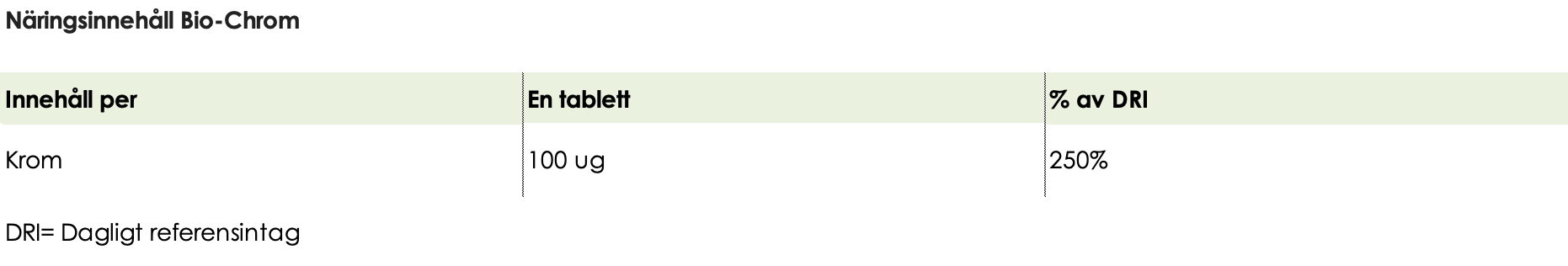 Varje tablett Bio-Chrom innehåller 100 mikrogram elementärt krom. Kromet som används i Bio-Chrom är organiskt bundet, vilket betyder att det är bundet till jästens naturliga aminosyror (kromjäst). Det har en utmärkt biotillgänglighet och är upp till 10 gånger mer absorberbart än andra godkända kromkällor. Bio-Chrom är tillverkat med en patenterad, organisk källa som kallas ChromoPrecise®, vilket är en kromjäst utvecklad speciellt för att ge optimal biotillgänglighet. Denna specifika kromkälla tillverkas enligt GMP samt med högsta läkemedelsstandard för att säkerställa utmärkt kvalitet och säkerhet med grundlig dokumentation.
