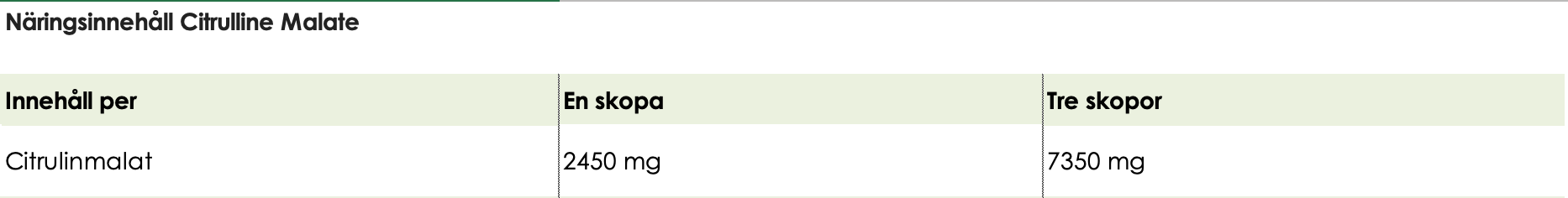 Doseringsanvisning: Blanda 1-3 skopor (2,5-7,5 g) Citrullin Malate med vatten. Inta ungefär en timme före träning. 7,5 g innehåller 7,35 g citrullin malat.