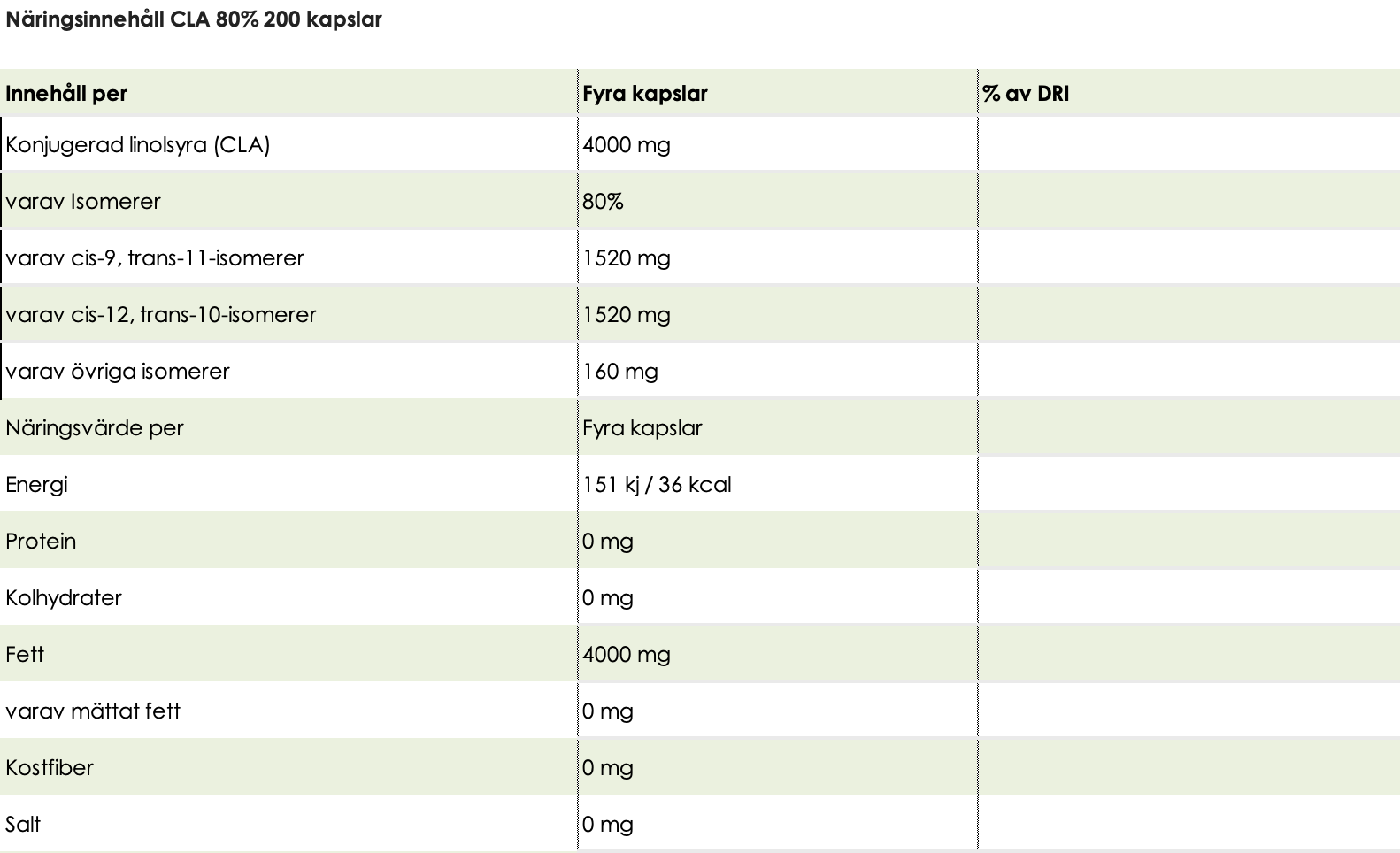 CLA (konjugerad Linolsyra) är en av de två essentiella (omättade) fettsyror som kroppen inte kan framställa.