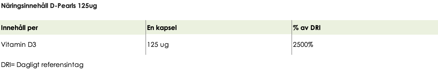 D-Pearls är ett högt doserat tillskott med inte mindre än 125 µg vitamin D per kapsel. Kapslarna är små och lätta att svälja. De går även bra att tugga.