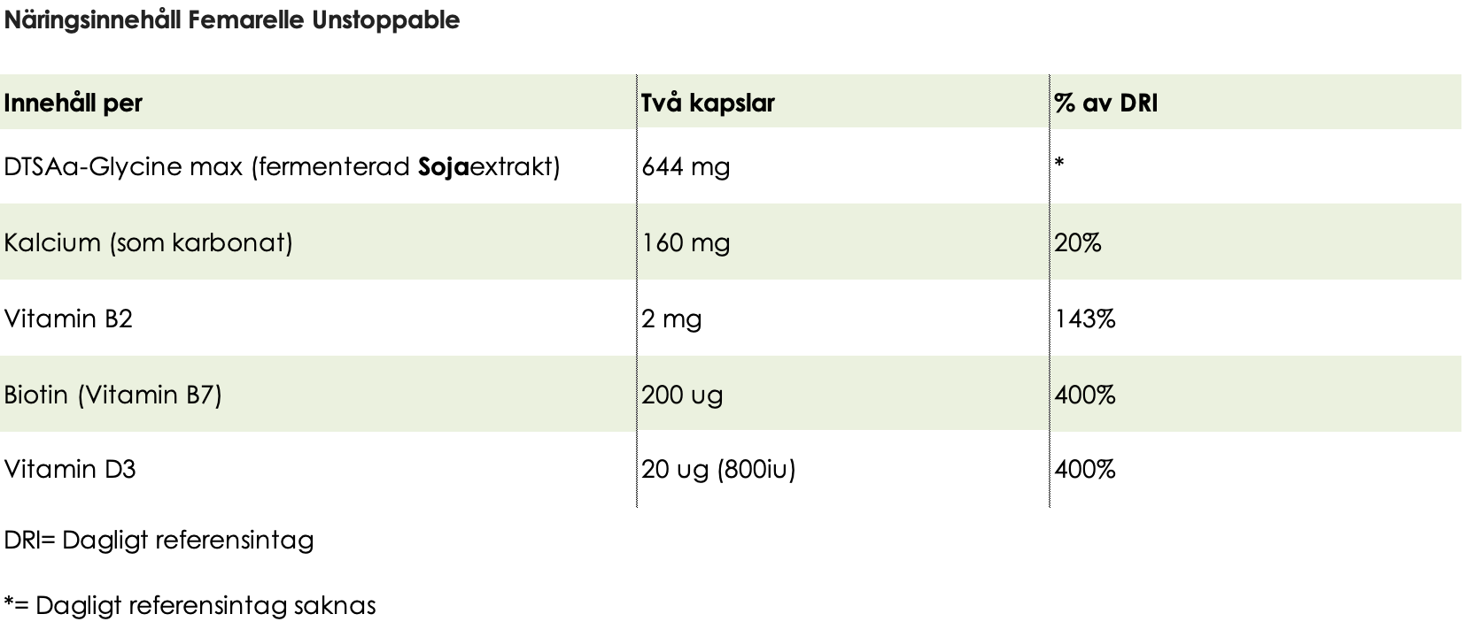 Femarelle Unstoppable innehåller den patenterade beståndsdelen DT56 som utvinns genom fermentering av en specifik typ av sojaböna. Femarelle Unstoppable innehåller även vitamin D, som bidrar till bevarandet av normal benvävnad, vitamin B2 som bidrar till minskad trötthet och utmattning och biotin som bidrar till en normal ämnesomsättning och stödjer en normal funktion av nervsystemet. Innehåller även kalcium.