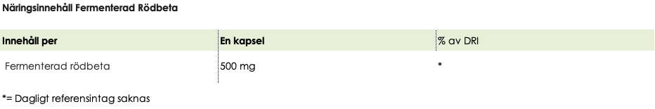 Fermenterad rödbeta (Beta vulgaris, rot), vegetabilisk kapsel (hydroxipropylmetylcellulosa).