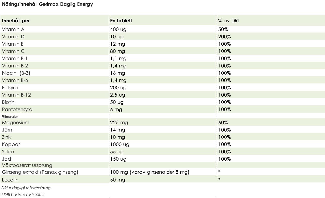 Gerimax Daglig Energi innehåller 12 vitaminer och 9 mineraler, bland annat vitamin B2, B6, B12, folsyra och pantotensyra som bidrar till att minska trötthet och utmattning. Med C-vitamin som bidrar till att skydda cellerna mot oxidativ stress och magnesium som bidrar till normal nerv- och muskelfunktion.