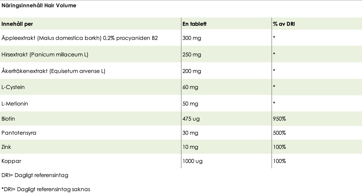 Hair Volume är ett kosttillskott med essentiella näringsämnen. Med åldern är det vanligt att håret blir tunnare delvis beroende på naturliga förändringar som ofta kan hänföras till hormoner, stress eller kostförändringar. Hair Volume är baserat på en innovativ sammansättning med äpple och hirs. Hair Volume innehåller aminosyror, åkerfräken, zink, aminosyror och mineraler som inkluderar koppar samt vitaminer. Hair Volume är den första produkten som innehåller naturligt proantocyanidin B2 växtfaktor från äpple.