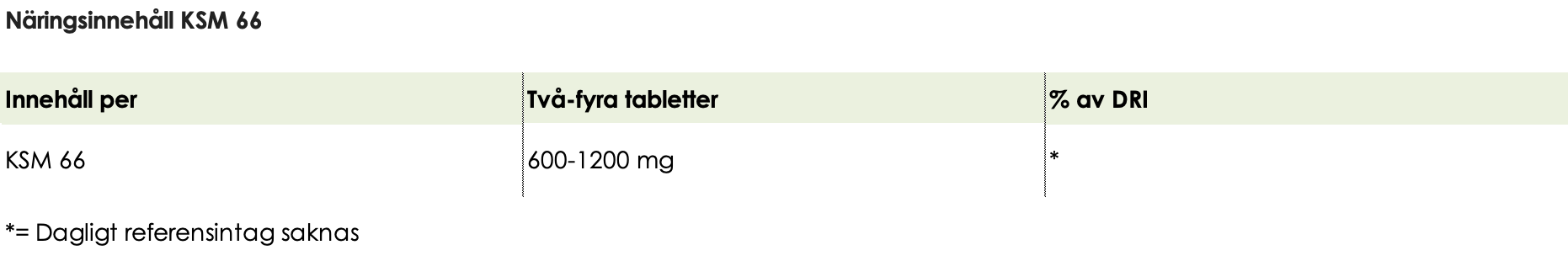 KSM66® Ashwagandha är ett kliniskt testat kosttillskott med extrakt av örten ashwagandha. KSM66® har 18 kliniska studier i ryggen som bekräftar att denna typ av patenterad ashwagandha har effekt. KSM66® Ashwagandha innehåller ett fullspektrumextrakt av ekologiskt odlad ashwagandha. KSM66® är även framställd genom "Green Chemistry" som är en ekologisk, ren och miljövänlig framställning där man inte använder sig av kemiska lösningsmedel eller alkohol. Detta bidrar även till att KSM66® tas lättare upp av kroppen. Ekologiskt odlad ashwagandha KSM66® är kliniskt dokumenterat Extraherad enligt Ayurvedisk tradition KSM66® Ashwagandha är extraherad enligt Ayurvedisk tradition och innehåller därav spår av ekologisk mjölk, vilket kan ge besvär hos mjölkproteinallergiker.
