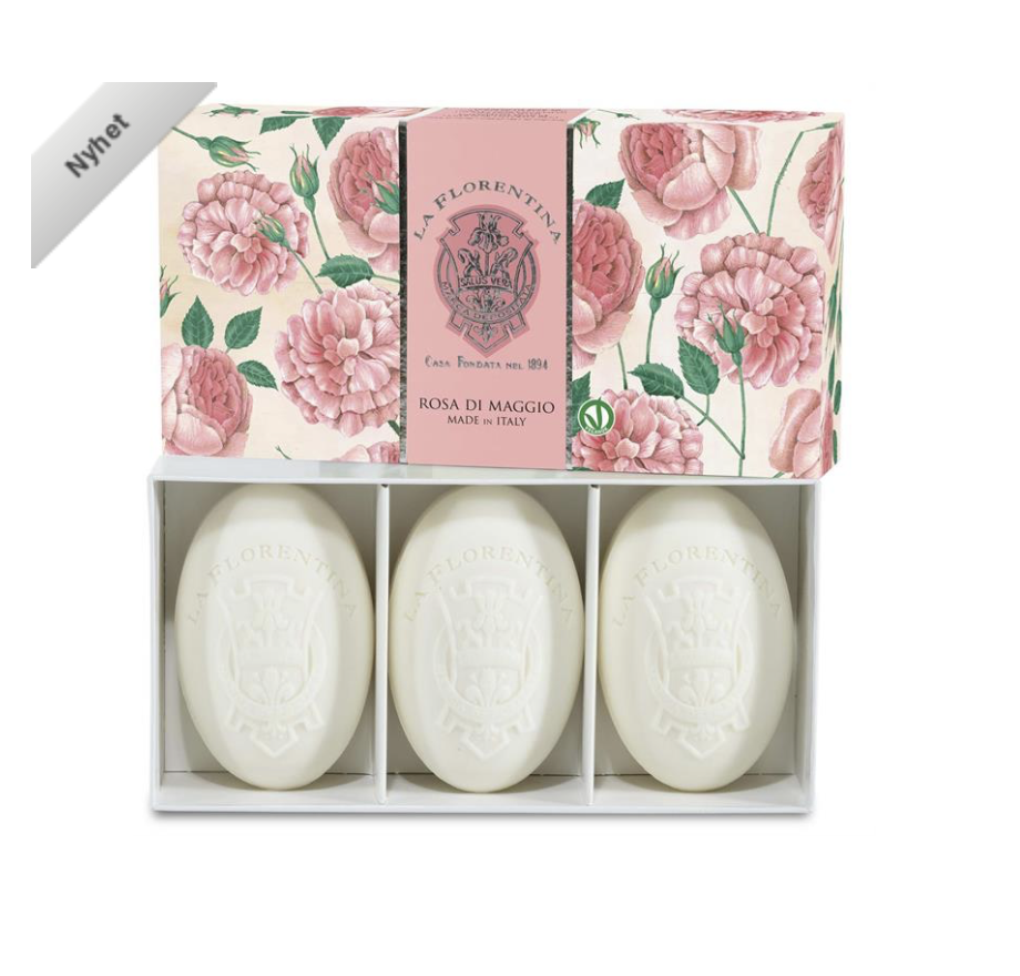 Vackra rostvålar 3 x 150g i en fantastik vacker ask, tvålarna är handgjord i Toscana med olivolja och ekologiskt naturligt ros extrakt, berikad med karitesmör som ger en extra fuktgivande och krämig effekt.