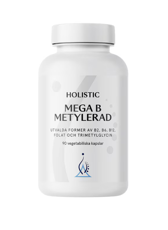 Holistic Mega B metylerad är ett kosttillskott med utvalda former av vitamin B2, B6, B12, folat och tri-metylglycin. Holistics källa till vitamin B12 är metylkobalamin. Källan till vitamin B6 är pyridoxal 5-phosphate (P5P), som är delaktig i mer än 160 olika enzymreaktioner i kroppen. Som källa till folat används 5-metyltetrahydrofolat. Holistics ingrediens heter Quatrefolic®. Tiamin, niacin, biotin, vitamin B6 och B12 bidrar samtliga till normal energiomsättning, till normal psykologisk funktion samt till nervsystemets normala funktion. Riboflavin, niacin, pantotensyra, vitamin B6, B12 och folat bidrar till att minska trötthet och utmattning. Riboflavin bidrar till normal järnomsättning, till att bibehålla normala röda blodkroppar och till att skydda cellerna mot oxidativ stress. Tiamin bidrar till normal hjärtfunktion. Vitamin B6, B12 och folat bidrar till immunsystemets normala funktion.