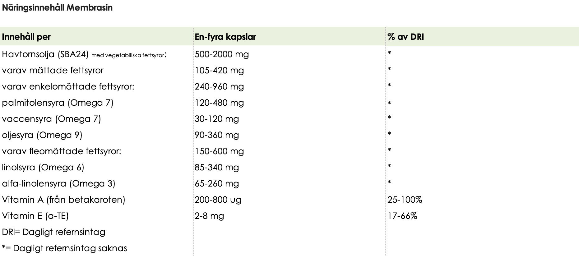 Havtornsoljan i Membrasin innehåller olika fettsyror. Den är speciellt rik på Omega-7. Dessutom innehåller den karotenoider och E-vitamin som finns naturligt i havtornsbären. Karotenoiderna kan i kroppen omvandlas till vitamin A, som bidrar till att bibehålla normala slemhinnor och hud. Förutom våra slemhinnor i ögon, mun och underliv så har vi även slemhinnor i t.ex. luftvägar, mag- och tarmsystemet och urinvägarna. Normalt fungerande slemhinnor har en smörjande funktion vilket kan ha mycket stor betydelse för livskvalitet och välbefinnande.