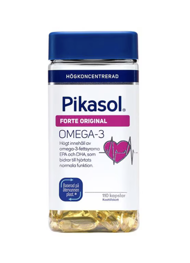 Pikasol Hjärta (tidigare Forte) Original är ett kosttillskott med högkoncentrerade omega-3-fettsyror, främst EPA och DHA. EPA och DHA bidrar till hjärtats normala funktion. Den gynnsamma effekten på hjärtat uppnås vid ett dagligt intag av 250 mg EPA och DHA. 2 kapslar Pikasol Forte Original innehåller 1120 mg EPA och DHA. DHA bidrar till bibehållen normal hjärnfunktion och normal synförmåga. Den gynnsamma effekten på hjärnan och synen uppnås vid ett dagligt intag av 250 mg DHA. 2 kapslar Pikasol Forte Original innehåller 420 mg DHA.