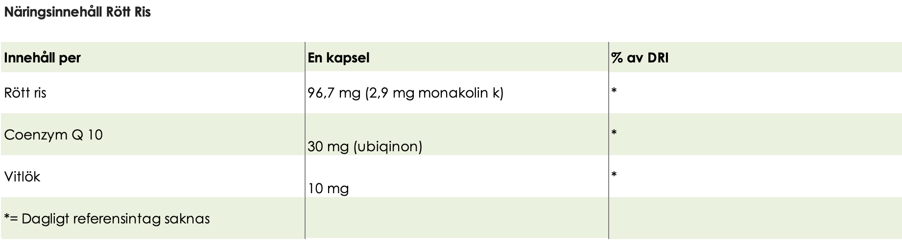 Röttrisextrakt (3% monakolin K), vegetabilisk kapsel (hydroxypropylmetylcellulosa), fyllnadsmedel (mikrokristalliserad cellulosa vegetabiliskt ursprung), klumpförebyggande ämne (risextrakt), Q 10 (ubiqinon).