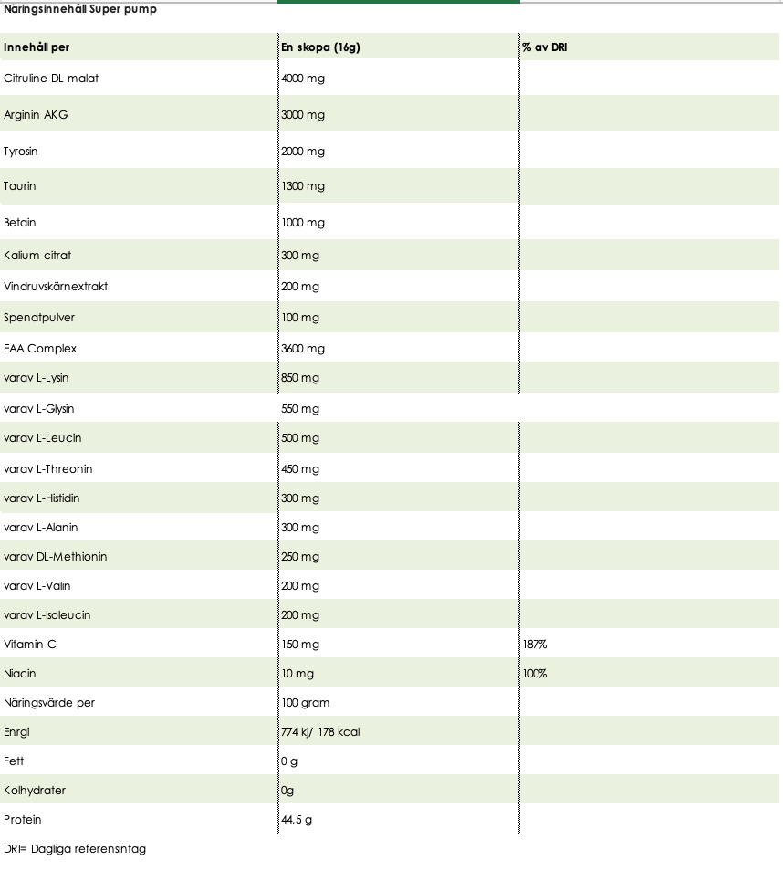 PUMP COMPLEX: Lejonparten av SUPER PUMP med hela 11 900 mg aktiva ingredienser. Här har Elit Nutrition kombinerat några av de mest populära ämnen som återfinns i en bra PWO men vi nöjde oss inte med det utan har även lagt till mer avancerade ingredienser så som vindruvkärnextrakt och det mycket koncentrerade Oxystorm®. Oxystorm är ett nitratextrakt från röd spenat där spenaten har koncentrerats 50 gånger.