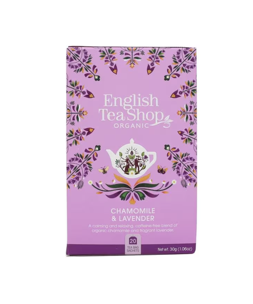 Te Örtte Kamomill lavendel från English Tea Shop är ett ekologiskt örtte med 70 % kamomill och 30 % lavendel. Smaken är mild och blommig med en len ton som för tankarna till en blommande sommaräng. Teet är helt koffeinfritt och passar bra att dricka på kvällen eller när du vill varva ner. Blandningen har en söt doft och en vacker gyllene färg. Ett enkelt och naturligt sätt att skapa ro i vardagen. Levereras i 20 påsar som är enkla att brygga. Förvaras torrt och svalt.