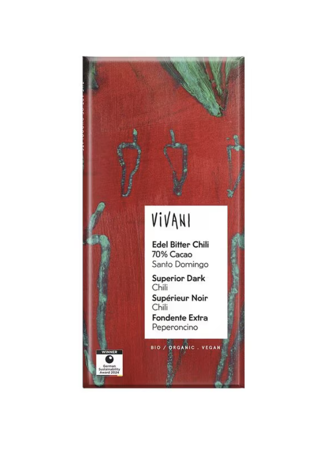 Denna choklad kombinerar kraften i 70 % ekologisk kakao från Dominikanska republiken med ett eldigt sting av torkad chili. Resultatet är en smakintensiv och välbalanserad chokladkaka som tilltalar dig som uppskattar lite hetta i det söta. Den tunna gourmetformen förstärker chokladens arom och låter smakerna utvecklas snabbt i munnen. Ett veganvänligt val, fritt från onödiga tillsatser och förpackat med omtanke om miljön.